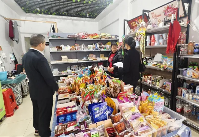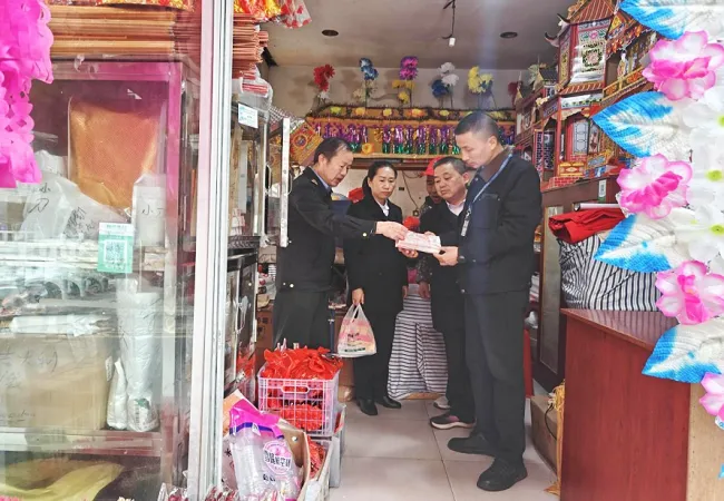 图为:工作人员逐户走访沿街商铺、祭祀用品店开展宣传活动