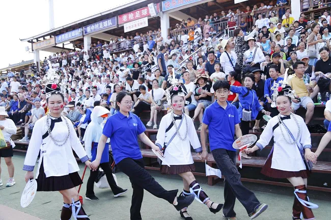 图为:建设银行黔东南分行工作人员与游客共迎“村超”盛会
